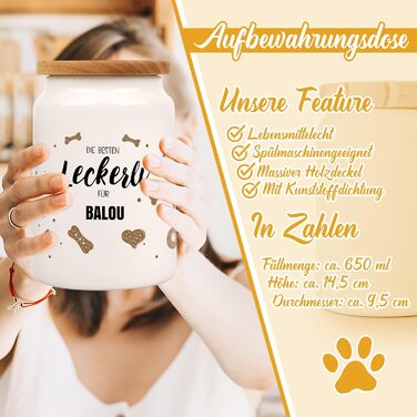 Опис Велика персоналізована керамічна банка для смаколиків з іменем для собак і котів PfotenSchild, з дерев'яною кришкою — подарункова банка для зберігання ласощів
