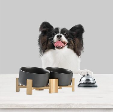Нахилена керамічна миска для собак і котів SPUNKYJUNKY з дерев'яною підставкою, 15°, 2×850 мл, чорна, для плосколицих, малих і середніх порід, нековзка, для корму і води