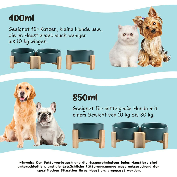 Опис Керамічна миска для собак і котів SPUNKYJUNKY, 15° нахил, з дерев'яною підставкою, 2×400 мл, зелена, нековзна, для плосколицих, дрібних і середніх порід