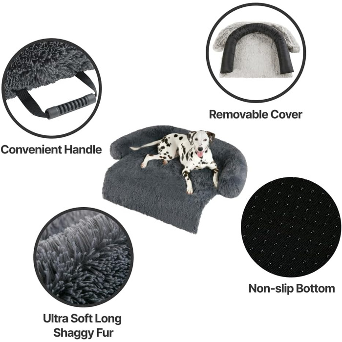 - Універсальне використання: можна використовувати на дивані вдома або в багажнику чи на задньому сидінні автомобіля під час подорожей, забезпечуючи комфортний і безпечний простір для вашого вихованця в різних сценаріях. На задній частині валика є ручка для зручного транспортування та зберігання. Така лежанка для собаки не є водонепроникною, але поверхня флісу може вбирати воду, до певної міри для захисту вода не проникає через диван або автомобільну подушку.