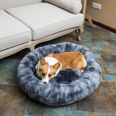 Опис Овальний заспокійливий лежак-донат для собак і котів з плюшевим штучним хутром, бежевий, розмір XL (91,4x68,6x17,8 см), машинне прання, для малих і середніх порід