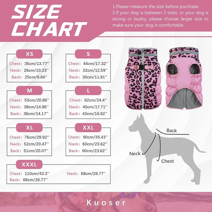 Опис Тепла куртка для собак Kuoser, зимовий вітрозахисний та водонепроникний одяг для малих і великих порід, з відбивачем і вбудованою шлейкою, рожевий, розмір L
