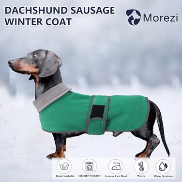 Опис Зимова куртка для собак MOREZI, утеплена флісом, з регульованою липучкою та високим коміром, для такс, малих і середніх мисливських порід, зелена, XS