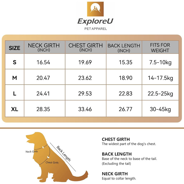 - Підбір розміру: Для правильної посадки дощовика для собак необхідно виміряти довжину тіла, грудей і шиї вашої собаки в дюймах і порівняти її з вказаною таблицею розмірів. Якщо розміри вашого вихованця знаходяться між двома розмірами, ми рекомендуємо замовити більший з двох розмірів.