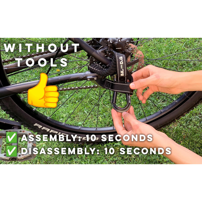 - Інструменти не потрібні: можна зібрати та розібрати за 10 секунд. Коли ремінь не використовується, його можна повністю прикріпити до велосипеда за допомогою спеціальних велосипедних ременів.
