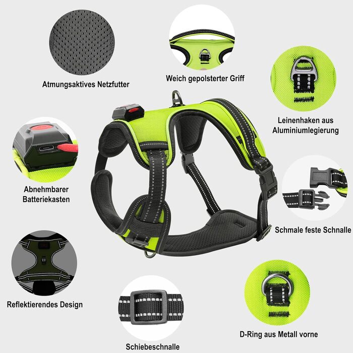 Опис Світловідбивний LED нашийник-жилет для собак Bpawser, без натягу, з ручкою, USB-зарядка, зелений, розмір XS