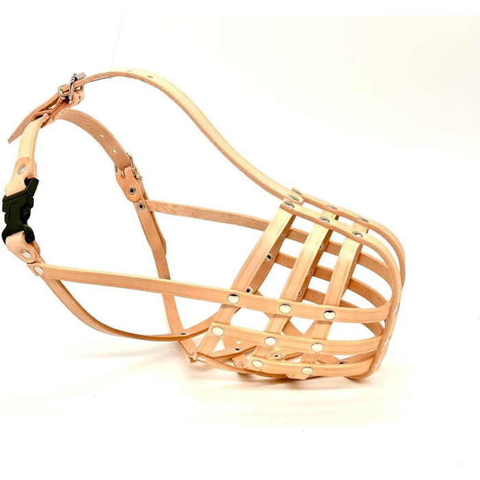 Так, завдяки міцній натуральній шкірі та клепаним кріпленням, цей намордник розрахований на собак, які можуть намагатися його гризти.