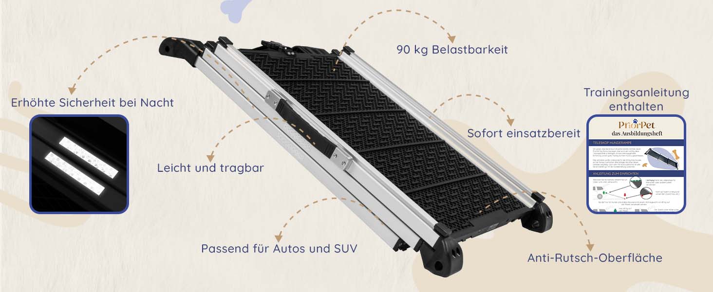 - ВИСУВНА КОМПАКТНА КОНСТРУКЦІЯ: Цей автомобіль з алюмінієвим пандусом для собак висувається, що забезпечує економію простору. Універсальна конструкція пандуса для собак адаптується до різних розмірів транспортного засобу.