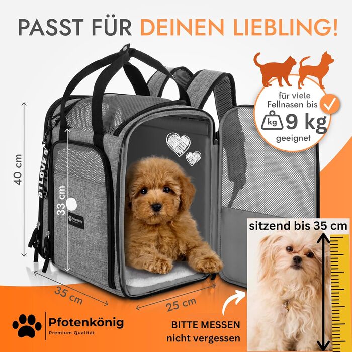 Преміум рюкзак-переноска для собак і котів PFOTENKÖNIG 3в1, до 9 кг, з ременем, для подорожей і транспортування, ідеальний для походів