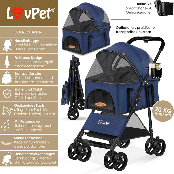 Коляска Lovpet 2-в-1 виготовлена з міцного та легкого металевого каркасу та дихаючої сітчастої тканини. Це забезпечує довговічність конструкції та комфорт для вашого улюбленця.