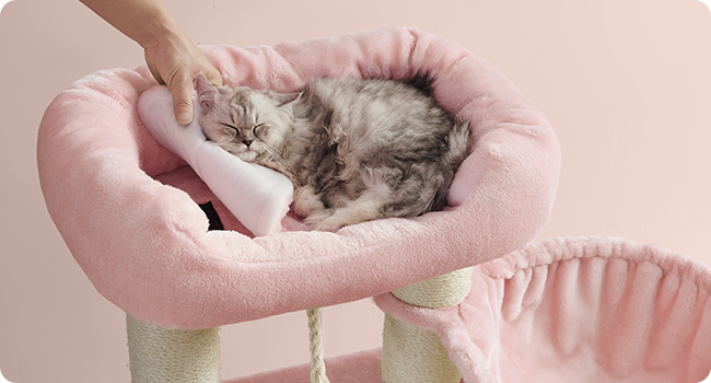 Опис Великий котячий комплекс Feandrea з будиночком, гамаком, тунелем, когтеточкою, сизалевими стовпчиками, плюшевою платформою, 50x50x141 см, пастельно-рожевий