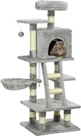 Опис Дряпак для котів PawHut 132 см із лежаком, іграшкою та будиночком, сірий, сизаль, для котів до 4,5 кг