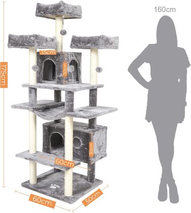 - ЗОНА КОМФОРТУ ДЛЯ ВАШОЇ КІШКИ З 2 печерами: Чудове обладнання цього котячого дерева 3 оглядові майданчики, з 2 печерами та плюшевими кульками з дзвіночками, затишна чи грайлива, кігтеточка буде використовуватися в настрої кожної кішки. Велика кігтеточка 175 см підходить для великих кішок, кошенят, дорослих кішок і кішок з обмеженими можливостями...