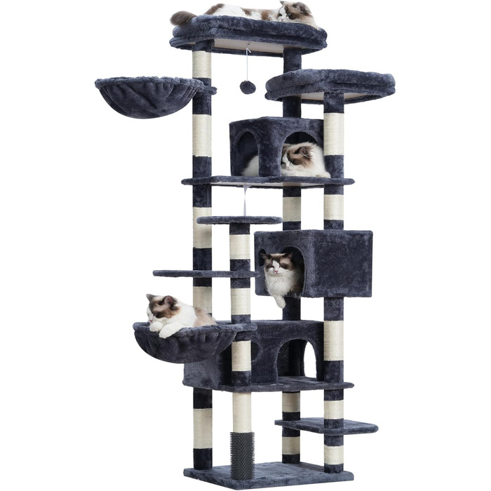 Опис Дряпка для котів Hey-brother 188 см, XXL, багатоярусний котячий комплекс з 2 великими платформами, 3 будиночками, 2 кошиками, іграшковими м'ячиками та сизалевими стовпами, димчасто-сірий MPJ035-MG