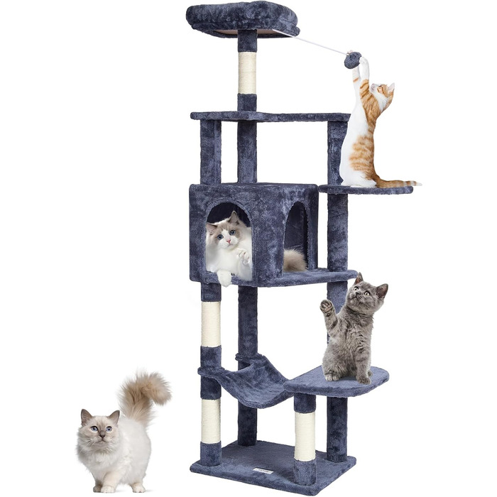Опис VEVOR Котячий драбинний комплекс 153 см, темно-сірий, з будиночком, когтеточкою з сизалю, гамаками, верхньою полицею, ігровими платформами та підвісною іграшкою для домашніх котів