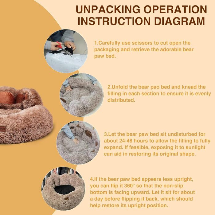 - * Відновлення вертикальної форми після розпакування: Щоб переконатися, що ложе ведмежої лапи зберегло свою вертикальну форму після розпакування, дотримуйтесь цих інструкцій: Замісіть начинку, щоб розподілити її рівномірно, і дайте ліжку спокійно постояти протягом 24-48 годин, щоб начинка повністю розширилася. Якщо є можливість, помістіть його на сонячне світло, щоб він знову знайшов свою первісну форму. Якщо ліжко здається менш вертикальним, поверніть його на 360 так, щоб нековзне дно було спрямоване вгору. Залиште його так на добу, а потім знову переверніть, щоб він знову стояв вертикально.
