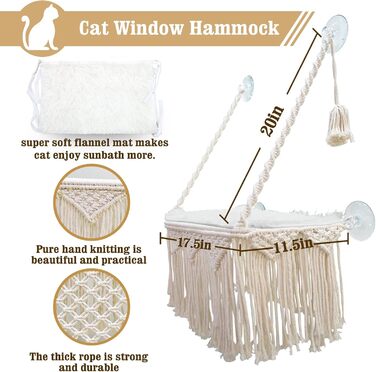 Опис Макраме лежак-гамак для кота на вікно Boho, настінний з кріпленням на присосках, флісова підстилка і іграшка-м'яч, для відпочинку, засмаги та огляду, до 4 кг