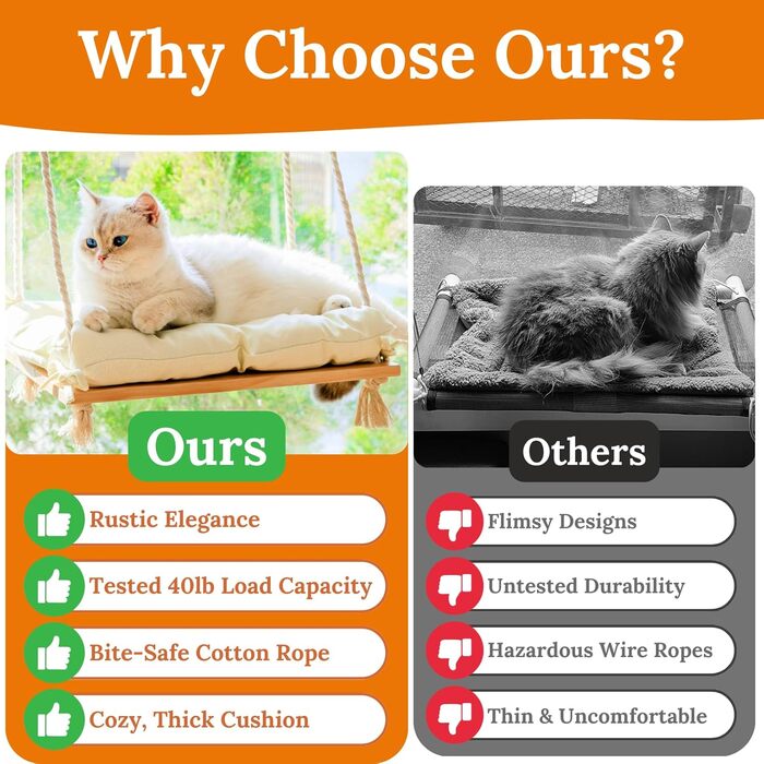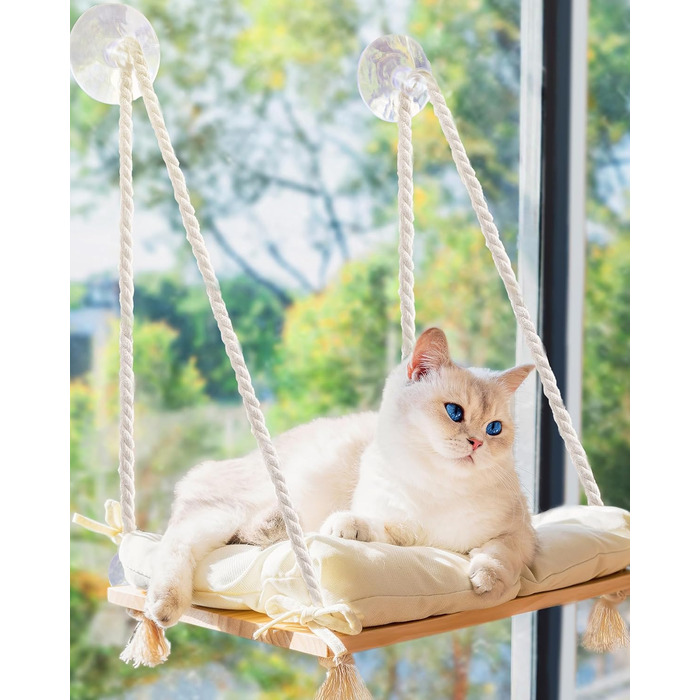 - Міцна та стабільна рама: виготовлена з міцної дошки з сосни та товстих бавовняних мотузок, а також з 4 міцними присосками, які можуть витримати до 11,3 кг, наше сидіння для котячого вікна гарантує довговічність і безпеку, поки ваша кішка насолоджується краєвидом.
