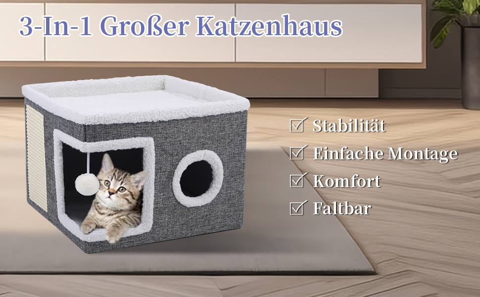 - 3-шаровий куб котячого будинку Три кішки можуть спати в ньому одночасно. Нижні дві зони забезпечують приховане та темне спальне місце для котів, а верхню платформу можна використовувати, щоб оглядати зовнішнє середовище та дивитися вдалину. Це робить його ідеальним вибором для сімей з кількома котами