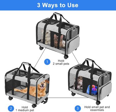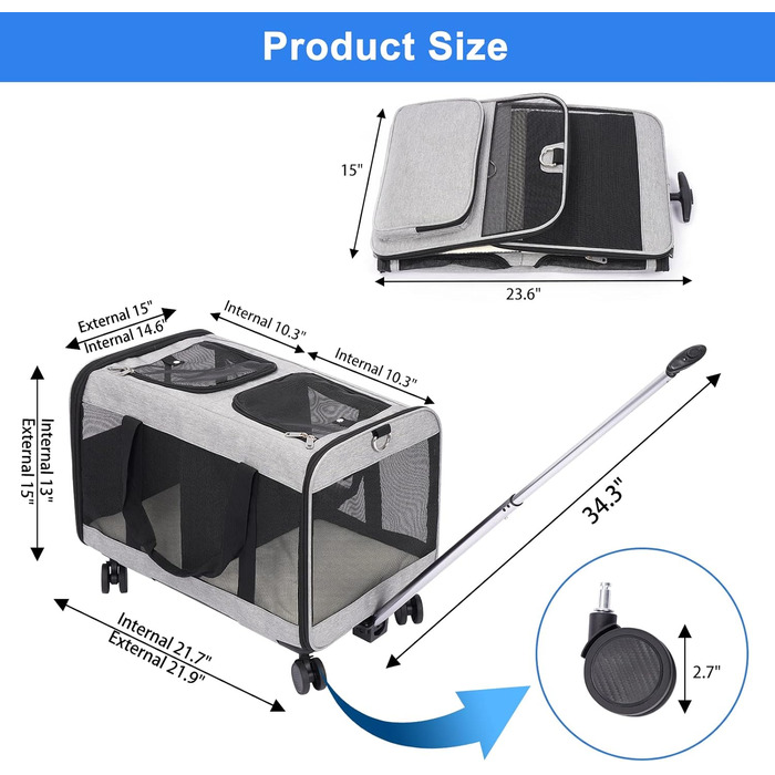 Опис Транспортна сумка FASNATI з двома відділеннями та знімною тележкою для котів і собак, переноска на колесах для двох тварин, добре вентильована, ідеальна для подорожей, прогулянок і кемпінгу, сіра