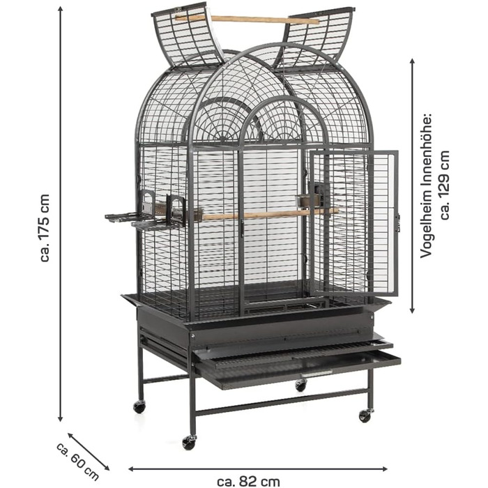 - Просторий та зручний простір: Розміри клітки (ШxГxВ) – приблизно 82 x 60 x 160 см (без фартуха) та 94 x 72 x 160 см (з фартухом). Внутрішня висота Vogelheim становить приблизно 129 см, що дає пташці достатньо місця для польотів та активності.