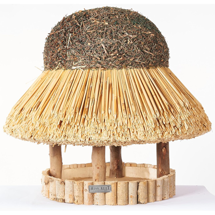 - Натуральні матеріали: Годівниця виготовлена з евкаліптового дерева, а покрівля складається зі справжньої, скріпленої солом'яної покрівлі та вересового гребеня.