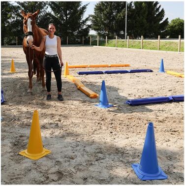 Опис Набір конусів Dönges XXL 10 шт. 50 см для тренувань, синьо-жовті – маркерні конуси для кінного спорту, дресирування, футболу, агіліті, вуличного спорту